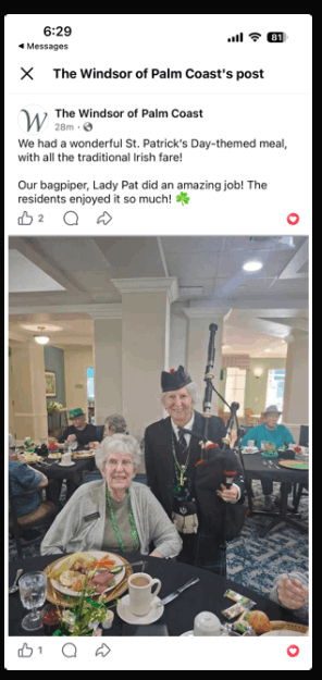 Bagpiper Pat at the Windsor Palm Coast for St. Patrick’s Day